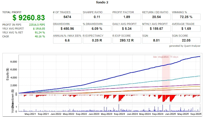 Con un Profit Factor de 2.54 y un drawdown controlado del 3.39%, se posiciona como un motor de estabilidad dentro del Fondo 2.